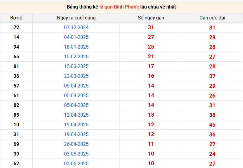 Bảng thống kê lô gan Bình Phước lâu về nhất 19/7/2025