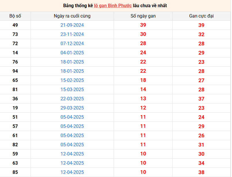 Bảng thống kê lô gan Bình Phước lâu về nhất 28/6/2025