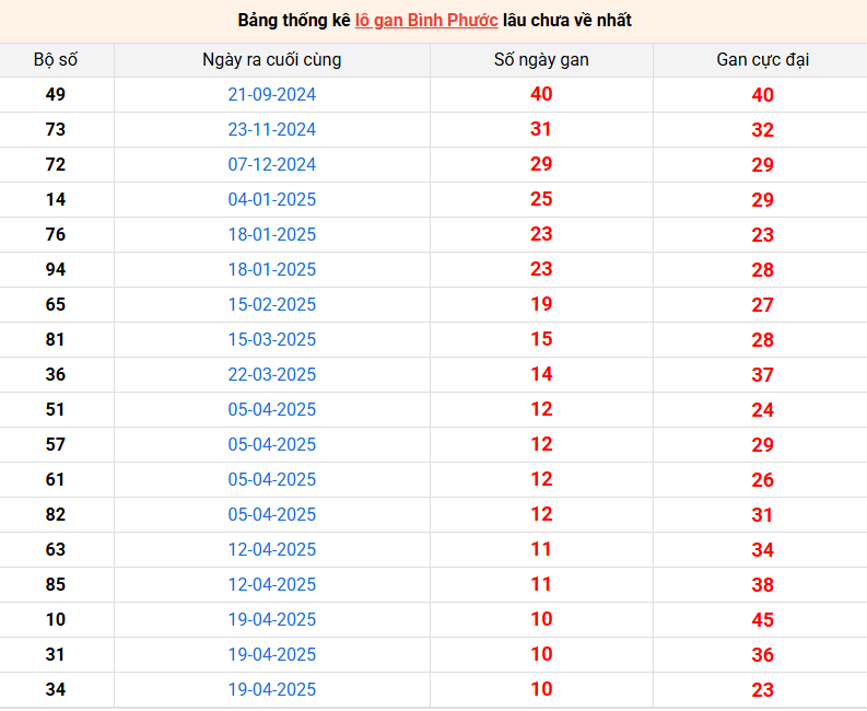 Bảng thống kê lô gan Bình Phước lâu về nhất 05/7/2025