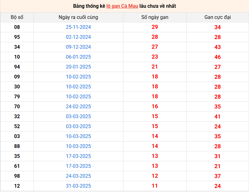 Bảng thống kê lô gan Cà Mau lâu về nhất 23/6/2025