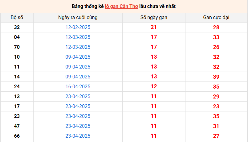 Bảng thống kê lô gan Cần Thơ lâu về nhất 16/7/2025
