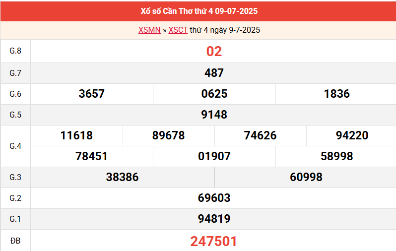 Bảng kết quả Cần Thơ ngày 09/7/2025 tuần trước