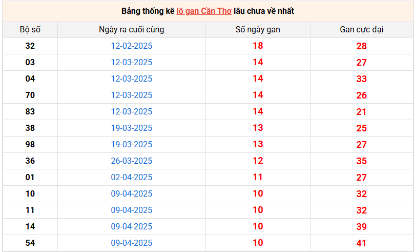 Bảng thống kê lô gan Cần Thơ lâu về nhất 25/6/2025