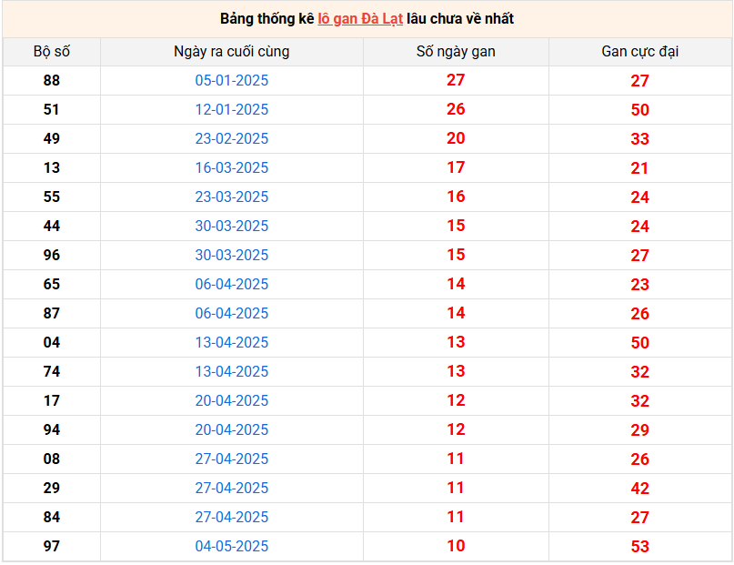 Bảng thống kê lô gan Đà Lạt lâu về nhất 20/7/2025