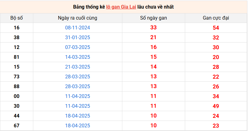 Bảng thống kê lô gan Gia Lai lâu về nhất 04/07/2025