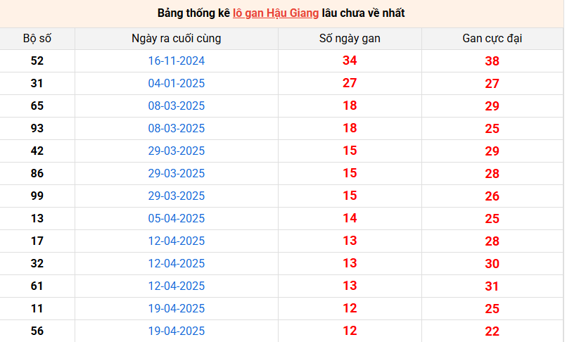 Bảng thống kê lô gan Hậu Giang lâu về nhất 19/7/2025