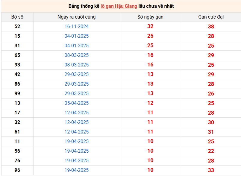 Bảng thống kê lô gan Hậu Giang lâu về nhất 05/7/2025