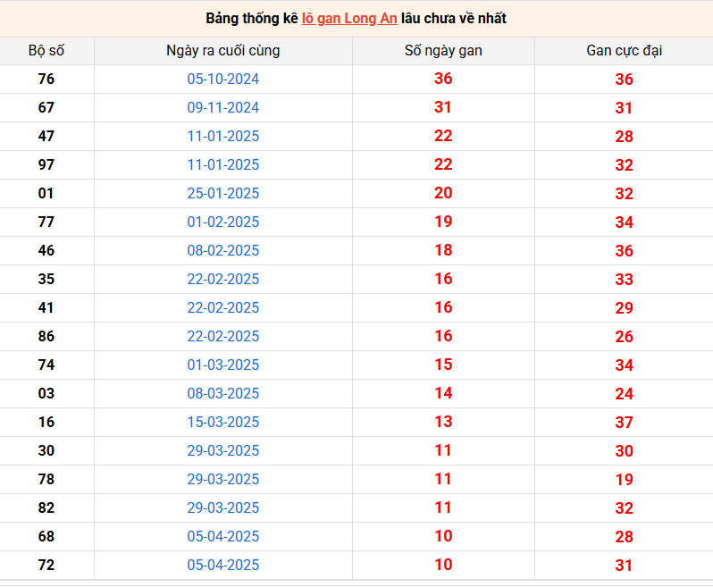 Bảng thống kê lô gan Long An lâu về nhất 21/6/2025