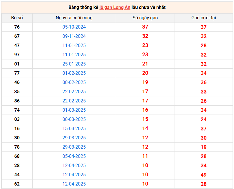 Bảng thống kê lô gan Long An lâu về nhất 28/6/2025