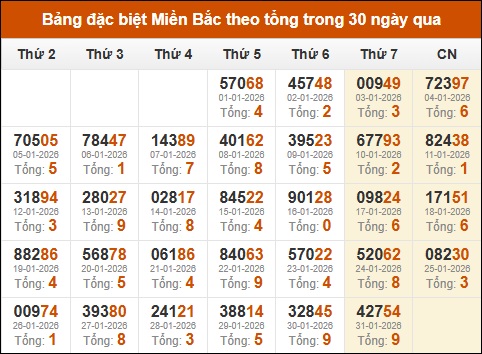 Thống kê GĐB xổ số miền Bắc theo tổng trong 30 ngày tính đến 01/02/2026