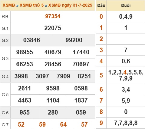 Dựa vào bảng kết quả xổ số miền Bắc ngày 31/07/2025, chuyên trang xin đưa ra những nhận định thống kê kết quả XSMB chi tiết như sau: