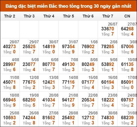Thống kê GĐB miền Bắc theo tổng trong 30 ngày tính đến 01/09/2025