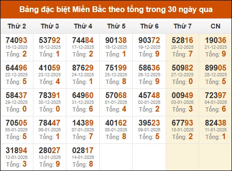 Thống kê GĐB XSMB theo tổng trong 30 ngày gần đây tính đến 15/01/2026