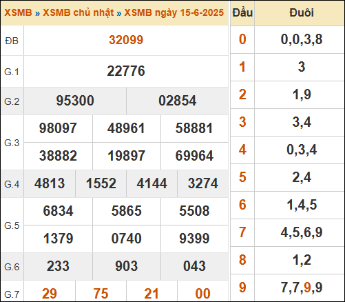 Kết quả xổ số miền Bắc ngày 15/6/2025