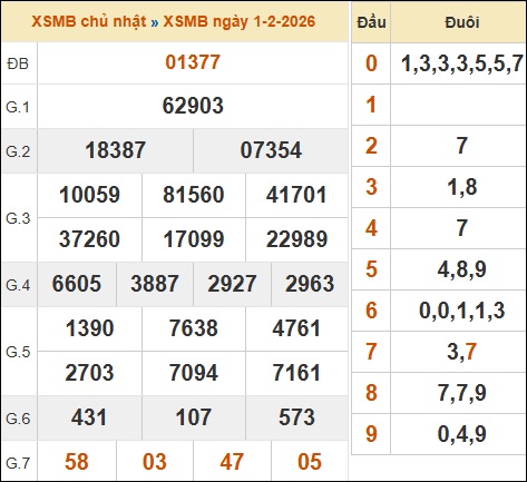 Dựa vào bảng kết quả xổ số Miền Bắc ngày 01/02/2026, chuyên trang mời bạn tham khảo thống kê phân tích kết quả như sau: