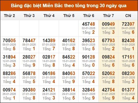 Thống kê GĐB miền Bắc theo tổng trong 30 ngày tính đến 02/02/2026