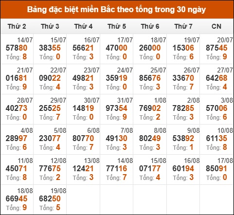 Thống kê GĐB miền Bắc theo tổng trong 30 ngày qua tính đến 20/8/2025
