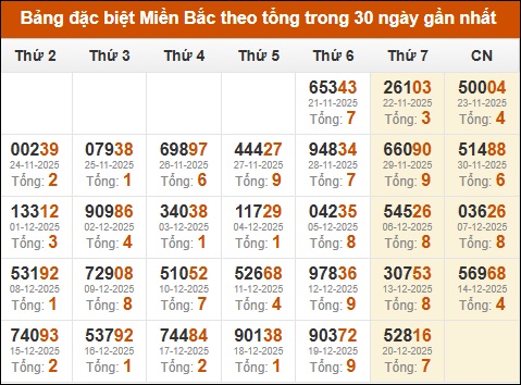 Thống kê GĐB xổ số miền Bắc theo tổng trong 30 ngày tính đến 21/12/2025