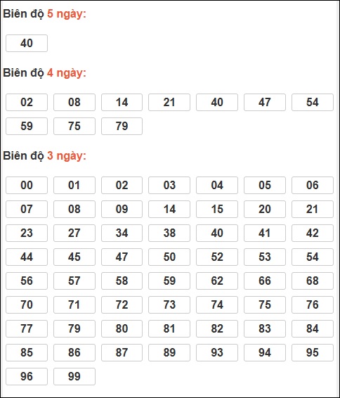 ⇒ Từ thống kê trên, ta thấy được tổng 5 gan nhất đã 37 ngày chưa xuất hiện, (bao gồm 10 cặp số: 05, 14, 23, 32, 41, 50, 69, 78, 87, 96)
