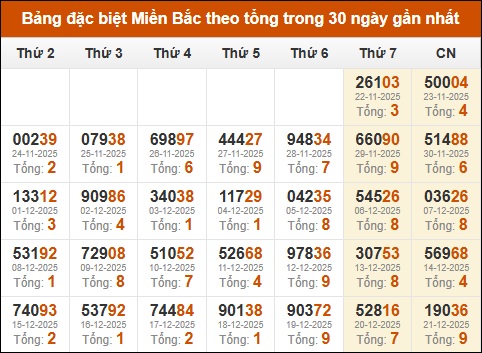 Thống kê GĐB miền Bắc theo tổng trong 30 ngày tính đến 22/12/2025