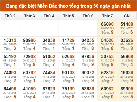 Thống kê GĐB miền Bắc theo tổng trong 30 ngày tính đến 29/12/2025
