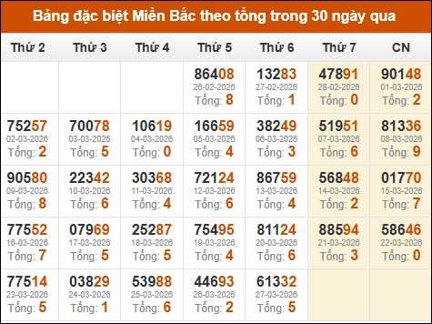 Thống kê GĐB xổ số miền Bắc theo tổng trong 30 ngày tính đến 29/03/2026