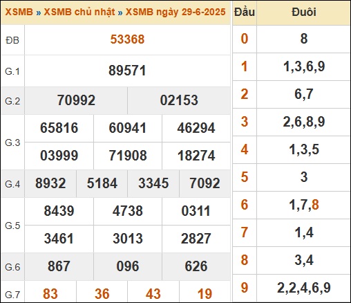 - Dựa Trên kết quả XSMB ngày: 29/06/2025