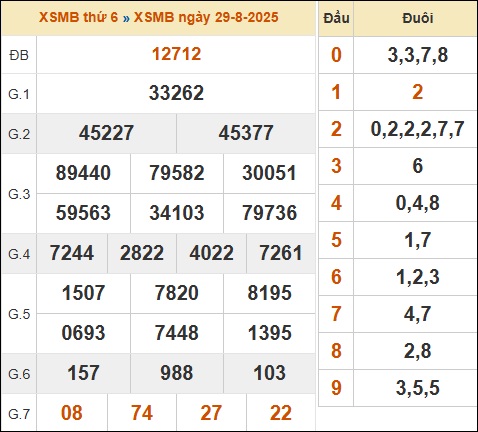 Dựa vào bảng kết quả xổ số Miền Bắc 29/08/2025 bên trên, chuyên trang mời bạn xem thống kê kết quả chi tiết sau đây:
