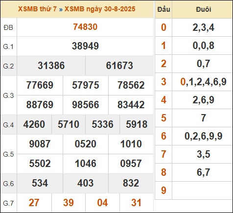 - Thống kê 2 số cuối giải đặc biệt XSMB ngày 31/08/2025