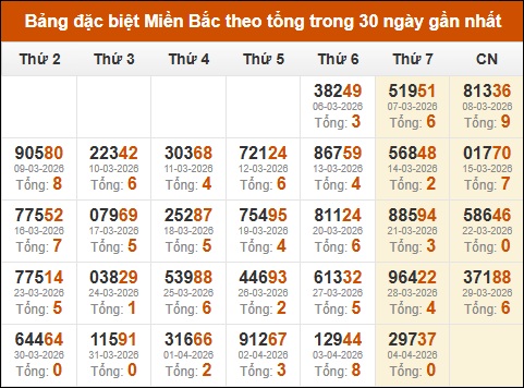 Thống kê GĐB xổ số miền Bắc theo tổng trong 30 ngày tính đến 05/04/2026