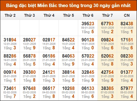 Thống kê GĐB miền Bắc theo tổng trong 30 ngày tính đến 09/02/2026