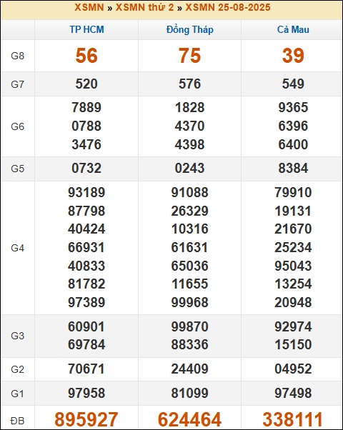 Kết quả xổ số Miền Nam 25/8/2025 thứ 2 tuần trước
