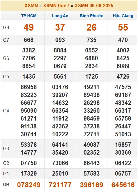 Kết quả xổ số Miền Nam 09/08/2025 thứ 7 tuần trước