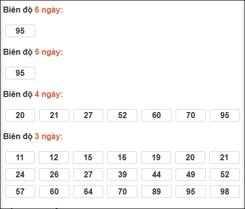 Đuôi 3: 5 ngày, Đuôi 1: 4 ngày, Đuôi 5: 4 ngày, Đuôi 6: 2 ngày, Đuôi 0: 1 ngày