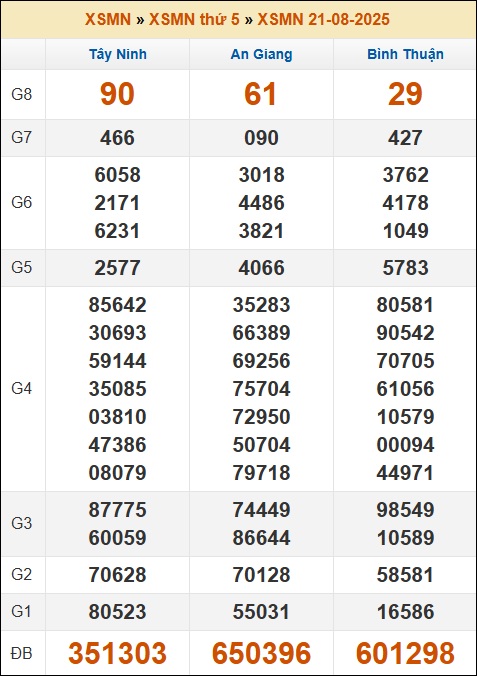 Kết quả xổ số Miền Nam 21/08/2025 thứ 5 tuần trước