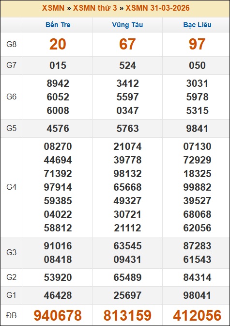 Kết quả xổ số Miền Nam 31/03/2026 thứ 3 tuần trước