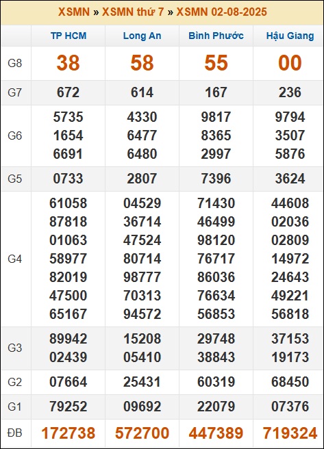 Kết quả xổ số Miền Nam 02/08/2025 thứ 7 tuần trước
