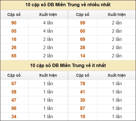 ⚡ 10 cặp số ĐB XSMT về nhiều nhất/ ít nhất tính đến ngày 11/12/2025: