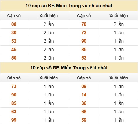 ⚡ 10 cặp số ĐB XSMT về nhiều nhất/ ít nhất tính dến ngày 13/03/2026: