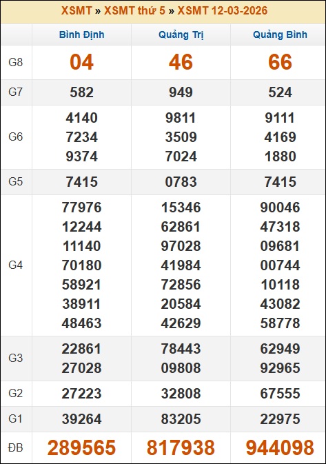 Kết quả xổ số Miền Trung 12/03/2026 thứ 5 tuần trước