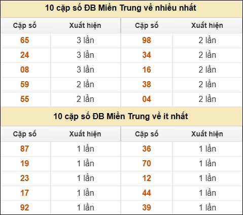 ⚡ 10 cặp số ĐB XSMT về nhiều nhất/ ít nhất tính đến ngày 19/03/2026: