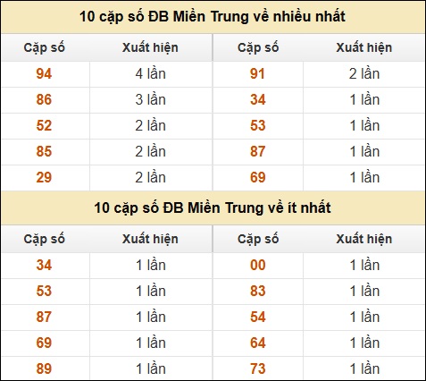 ⚡ 10 cặp số ĐB XSMT về nhiều nhất/ ít nhất tính dến ngày 25/12/2024: