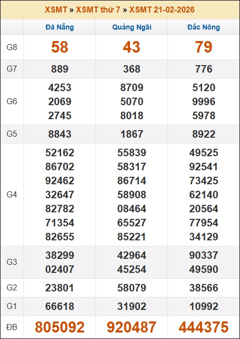 Kết quả xổ số Miền Trung 21/02/2026 thứ 7 tuần trước
