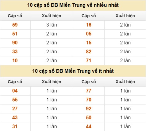⚡ 10 cặp số ĐB XSMT về nhiều nhất/ ít nhất tính đến ngày 28/8/2025: