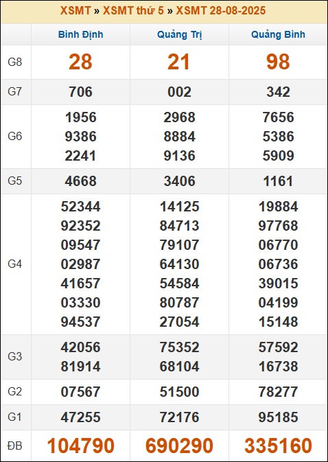 Kết quả xổ số Miền Trung 28/08/2025 thứ 5 tuần trước