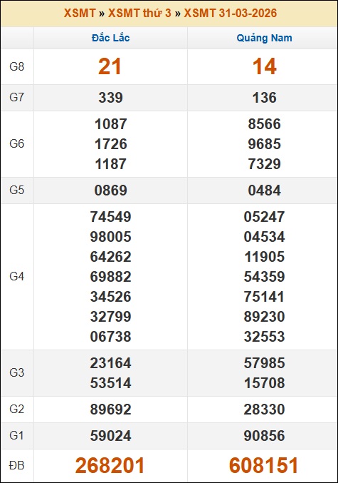 Kết quả xổ số Miền Trung 31/03/2026 thứ 3 tuần trước