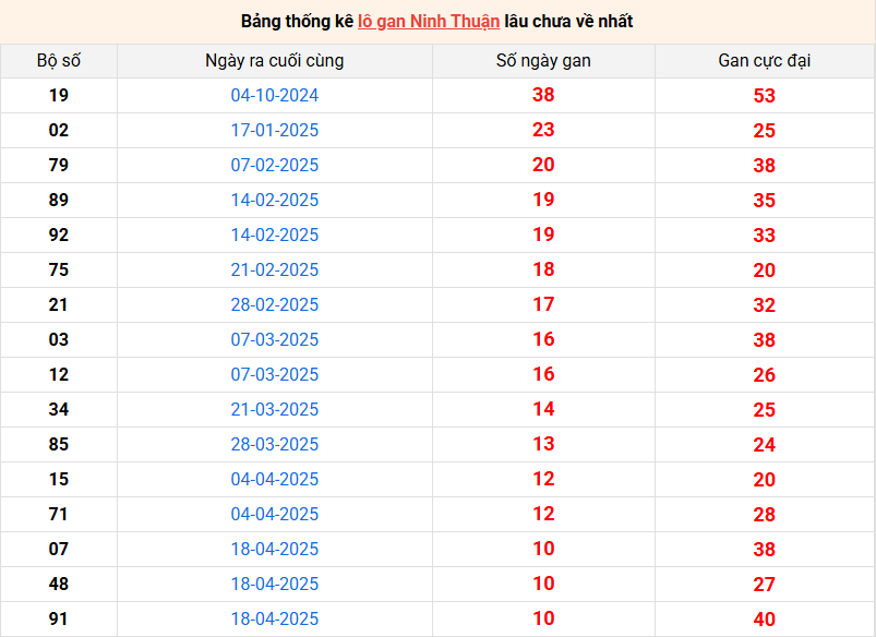 Bảng thống kê lô gan Ninh Thuận lâu về nhất 04/07/2025