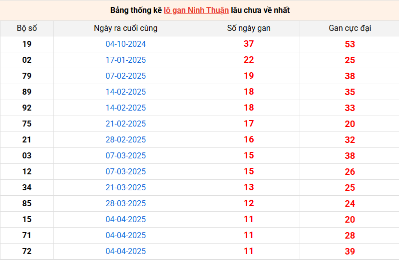 Bảng thống kê lô gan Ninh Thuận lâu về nhất 27/6/2025