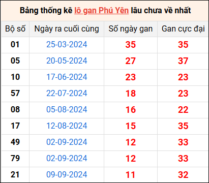 Bảng thống kê lô gan Phú Yên lâu về nhất 2/12/2024