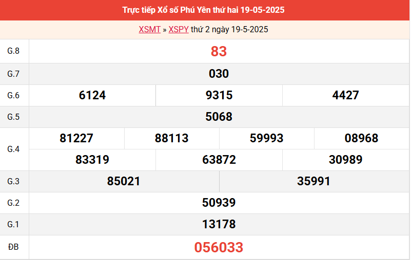 Kết quả xổ số Phú Yên ngày 19/5/2025